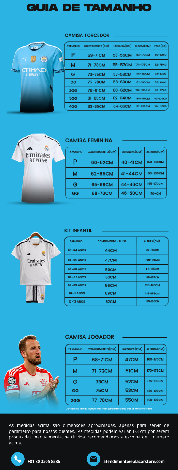 - Personalização exclusiva: escolha o nome e número do seu jogador favorito ou adicione o seu próprio nome, tornando sua camisa ainda mais especial.